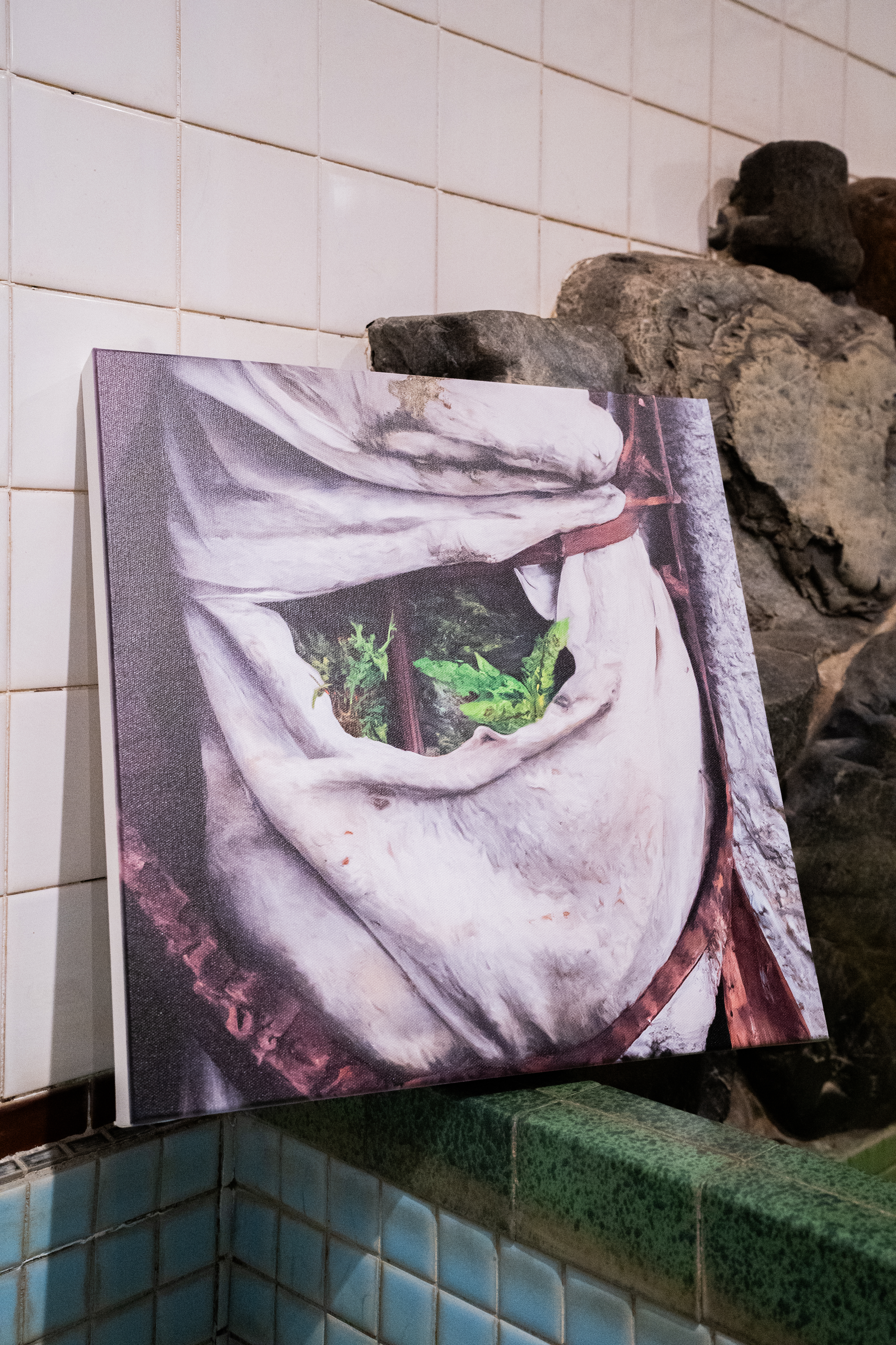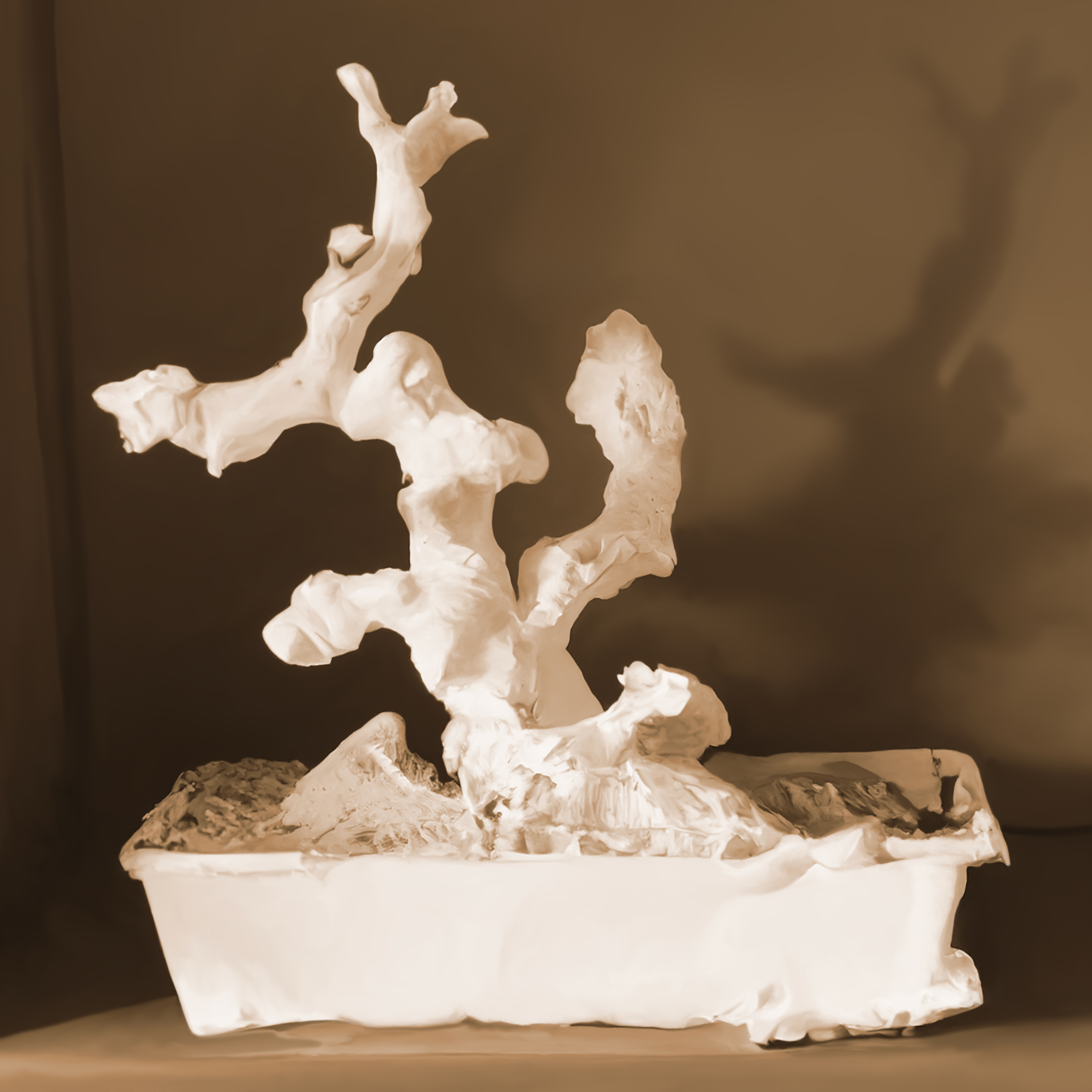In parallel, a series of paintings extends this cycle of transformations: a pot found on the street circulates from plaster casting to photography, from algorithmic interpretation to digital painting, before returning as a physical canvas. These metamorphoses inscribe each subject into a chain of mediations where the object is continually replayed, reinterpreted, and transfigured.