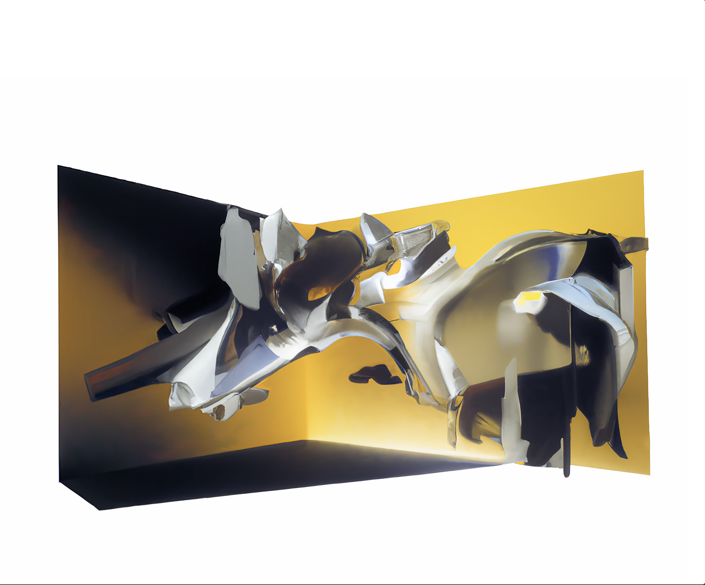 Ce projet constitue à la fois un hommage familial et une expérimentation contemporaine. Il prend pour point de départ l’œuvre réalisée en 1943 par mon grand-père, le peintre surréaliste Roberto Matta, intitulée Elle a été dépouillée de sa mariée, même par ses célibataires – une réinterprétation libre et cosmique du célèbre Grand Verre de Marcel Duchamp. Chez Matta, cette reprise convoquait déjà des paysages interstellaires, des machines noires et des métaphores alchimiques, où se superposaient forces cosmiques, distillations et métamorphoses.