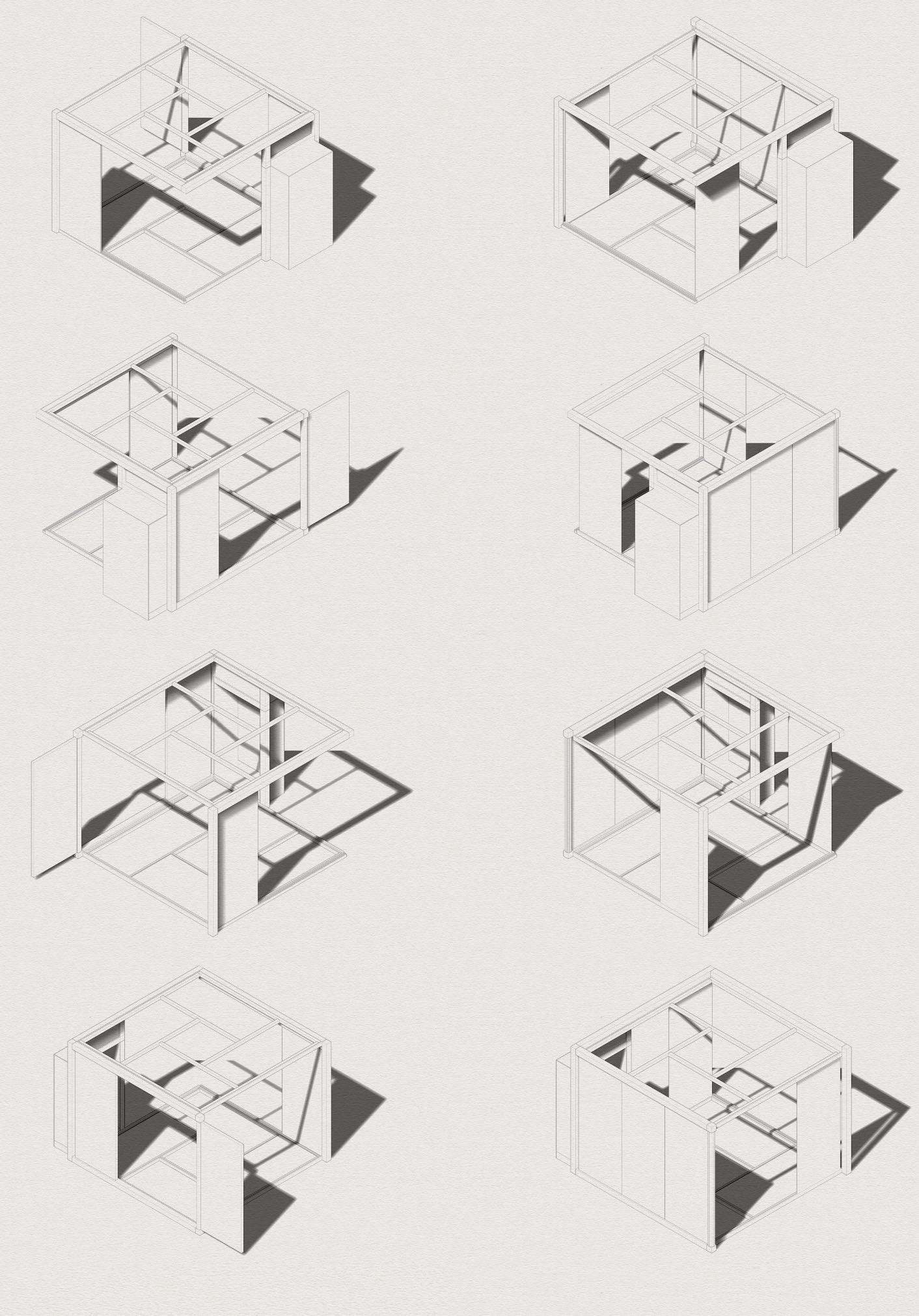 Les interventions se porteront sur les interstices entre les tatamis, dans lesquels viendront s’intercaler un système de rails (en bois ou aluminium profilé noir) permettant d’y placer et d’y faire glisser une multitudes de modules. Ces derniers seront dans la lignée de nos trois axes : faire (une caméra - possibilité de faire des travelling, un micro, etc), exposer (cimaises, écran de projection, etc) et habiter (tablette, fusuma, miroir).