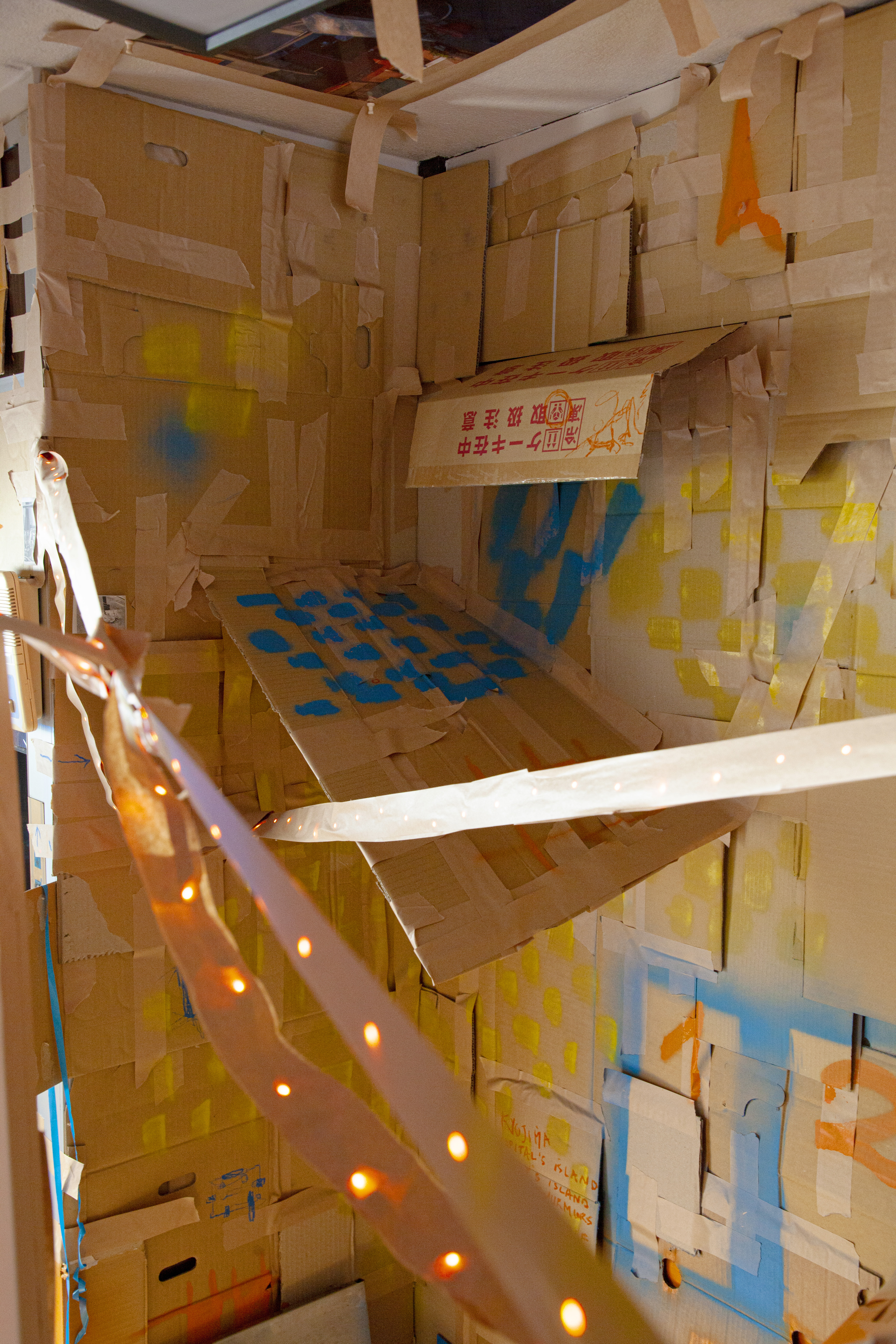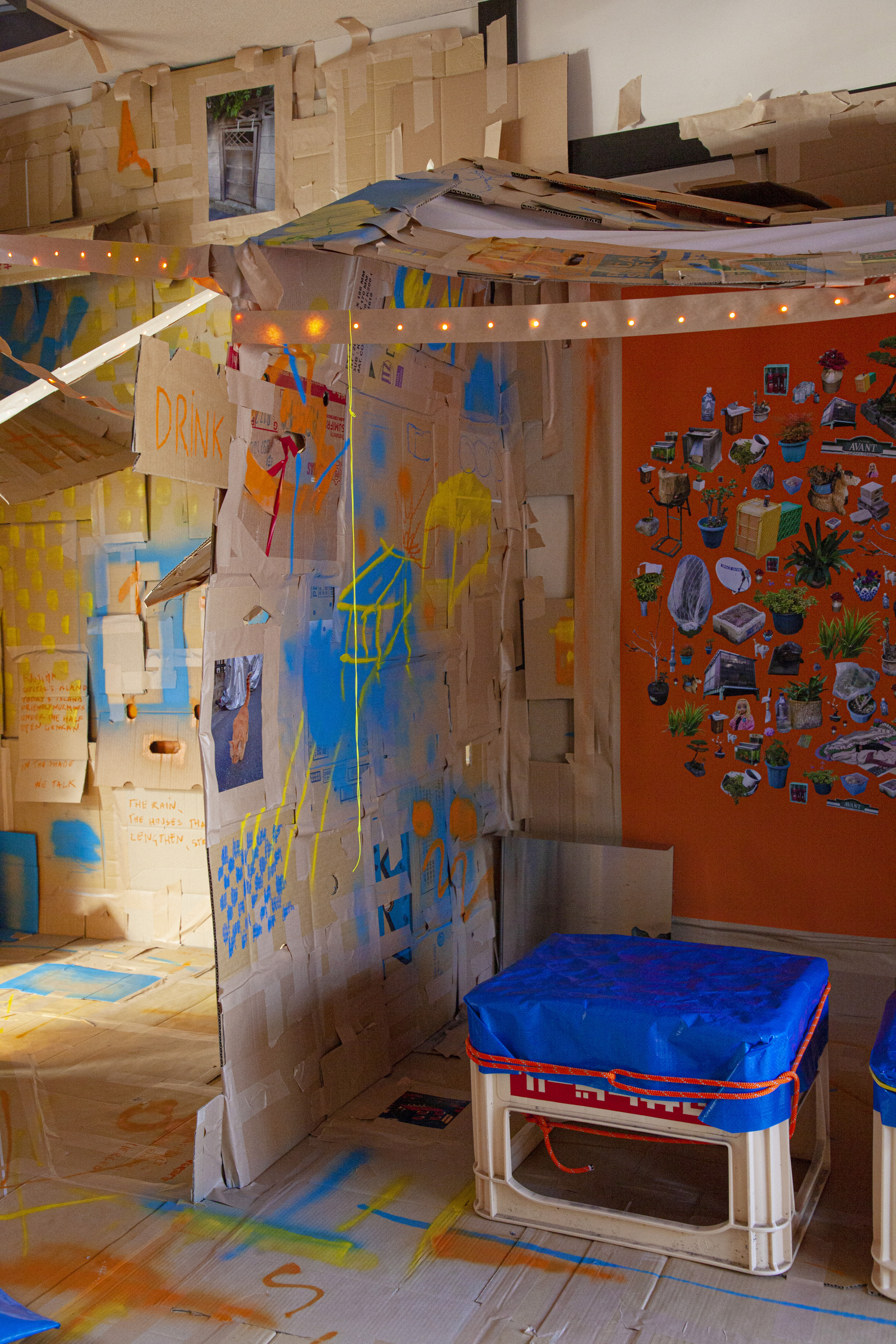 Disconoma propose donc une installation évoquant les caractéristiques typiques du yokocho (espace restreint et intimiste, lumières tamisées et colorées, odeurs métissées, bruits de vie) en les hybridant avec des éléments représentatifs de Kyojima (nagaya, DIY, travaux permanents, shotengai, végétation informelle vivace). Si la catastrophe de 1923 a permis l’apparition de ces formes architecturales, Disconoma explore également plastiquement la catastrophe dans leur installation - dans une esthétique tout en précarité et en métamorphose.