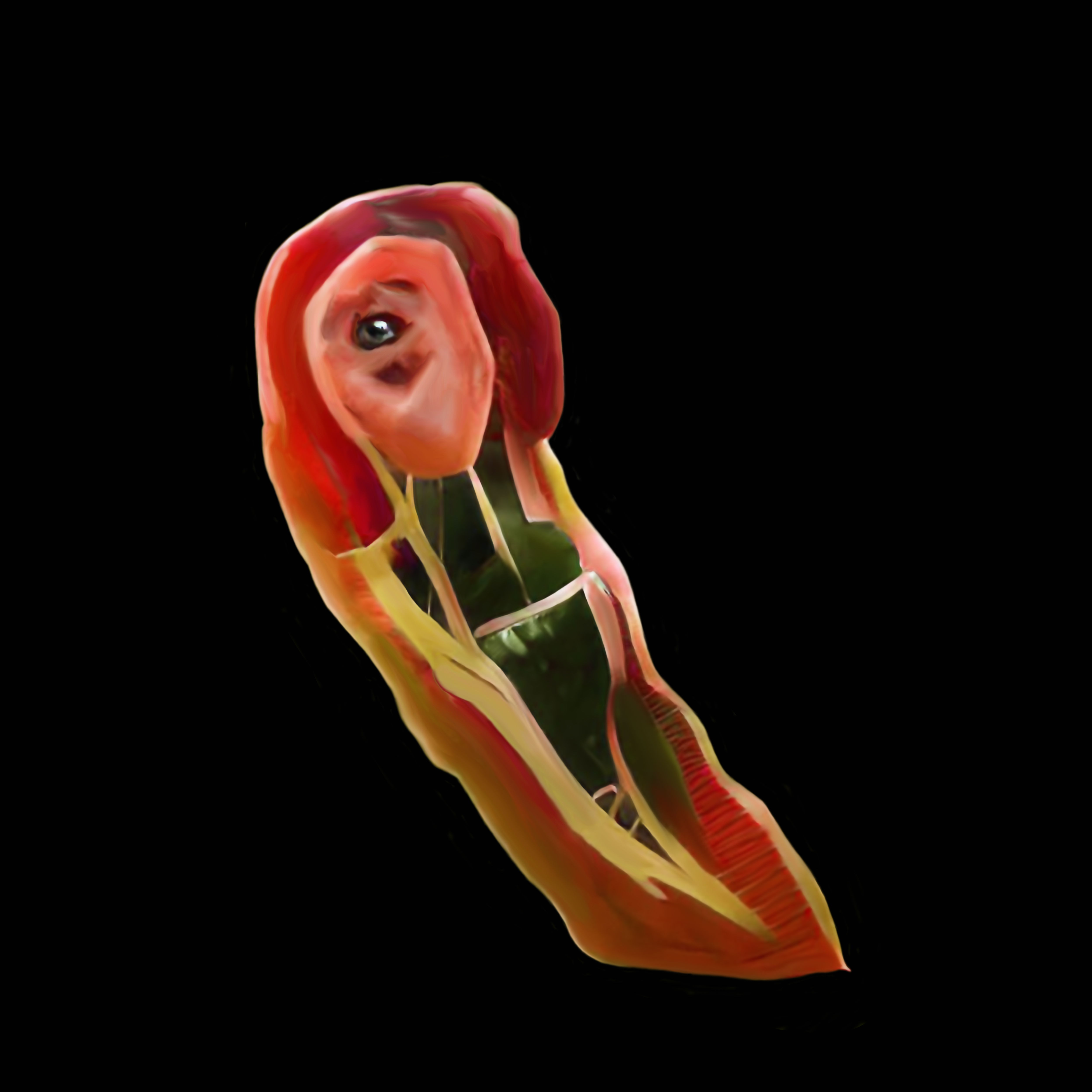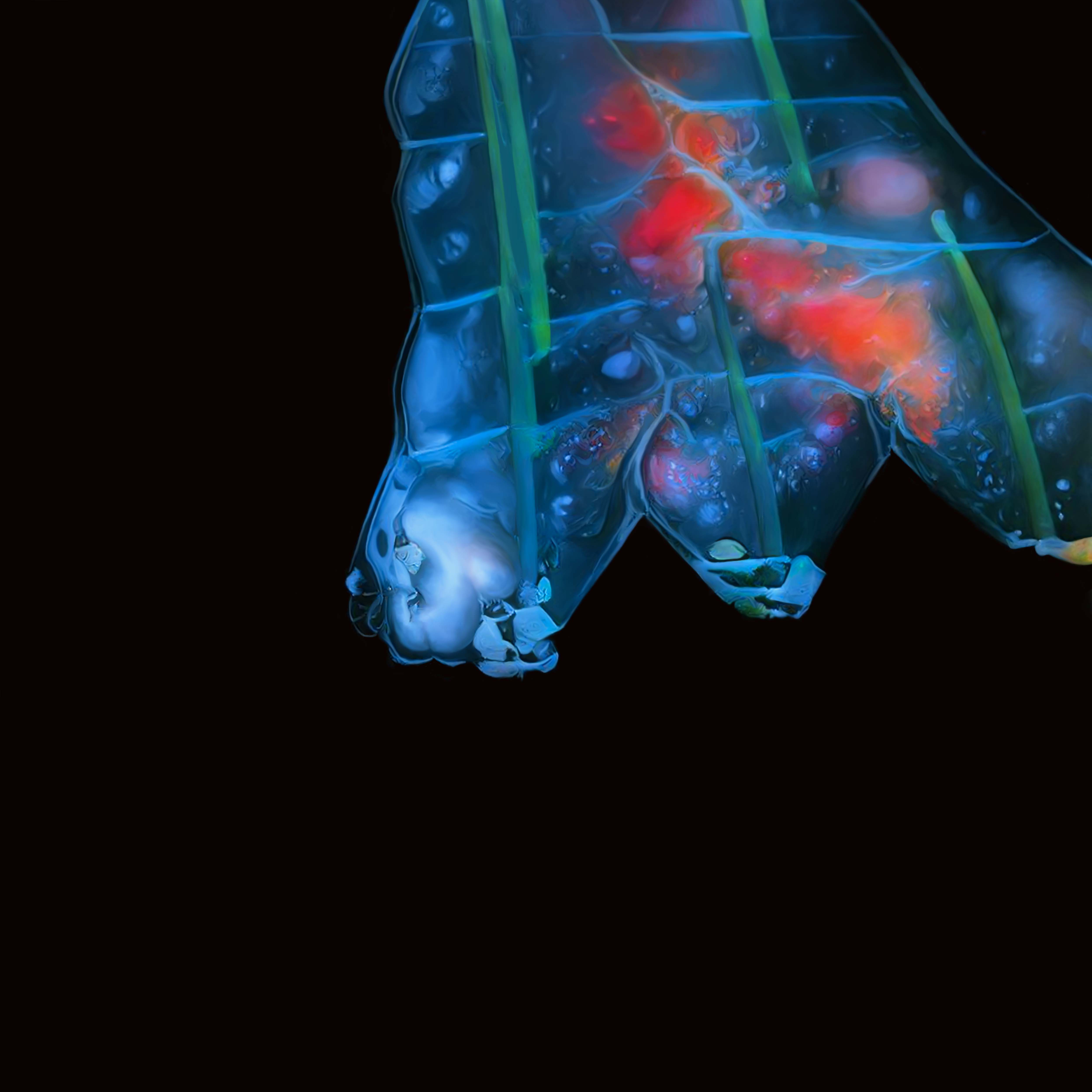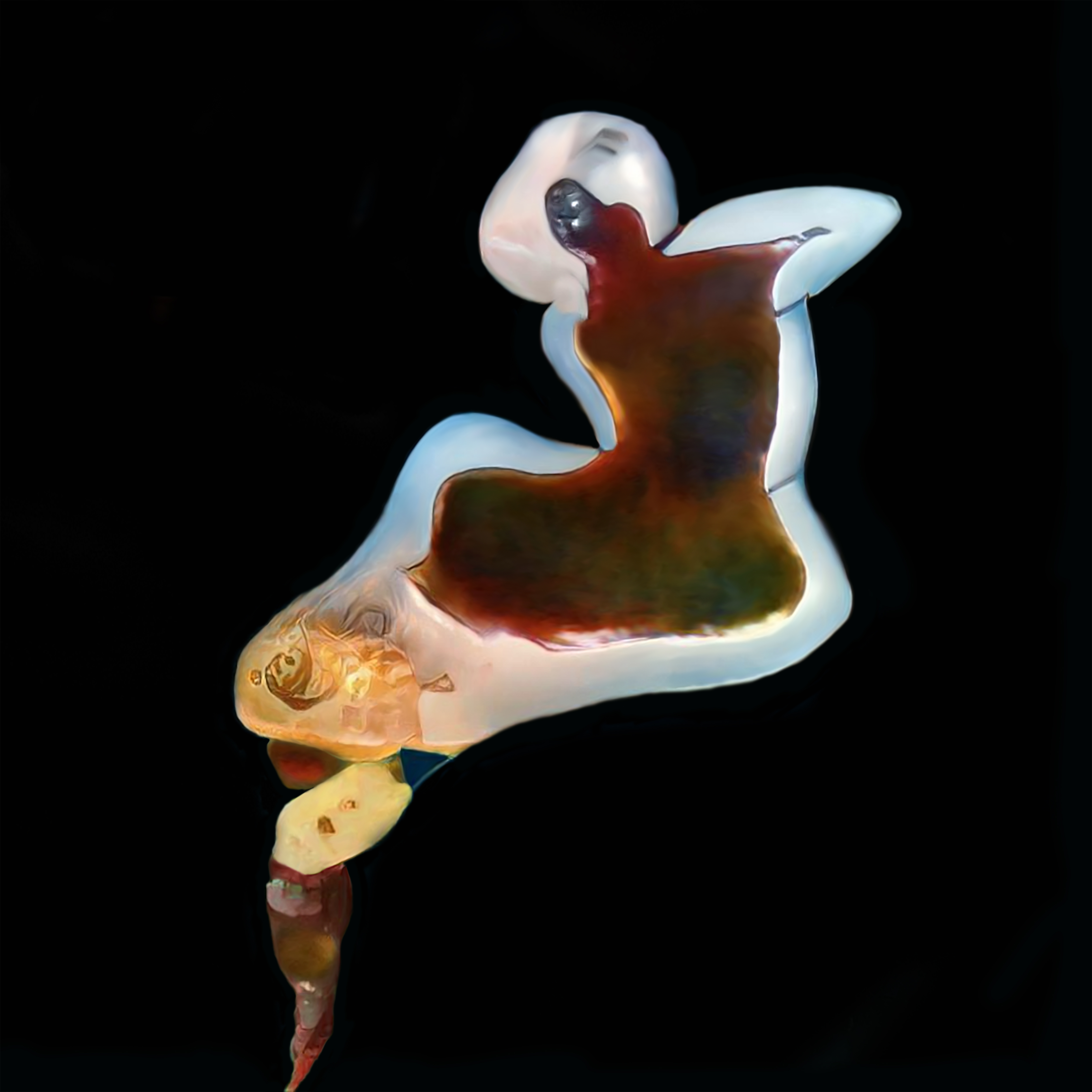 The generated images, selected for their metamorphic qualities, form an imaginary bestiary of ectoplasmic chimeras and animist morphologies. I intervened in three stages: formulating textual instructions, modifying visuals within the AI software, and finally reworking each image through digital painting. This iterative process enacts co-authorship and stages a dialogue between human subjectivity and technological randomness. I work with the “excesses” of AI, transforming its accidents and stains into dreamlike visions.
